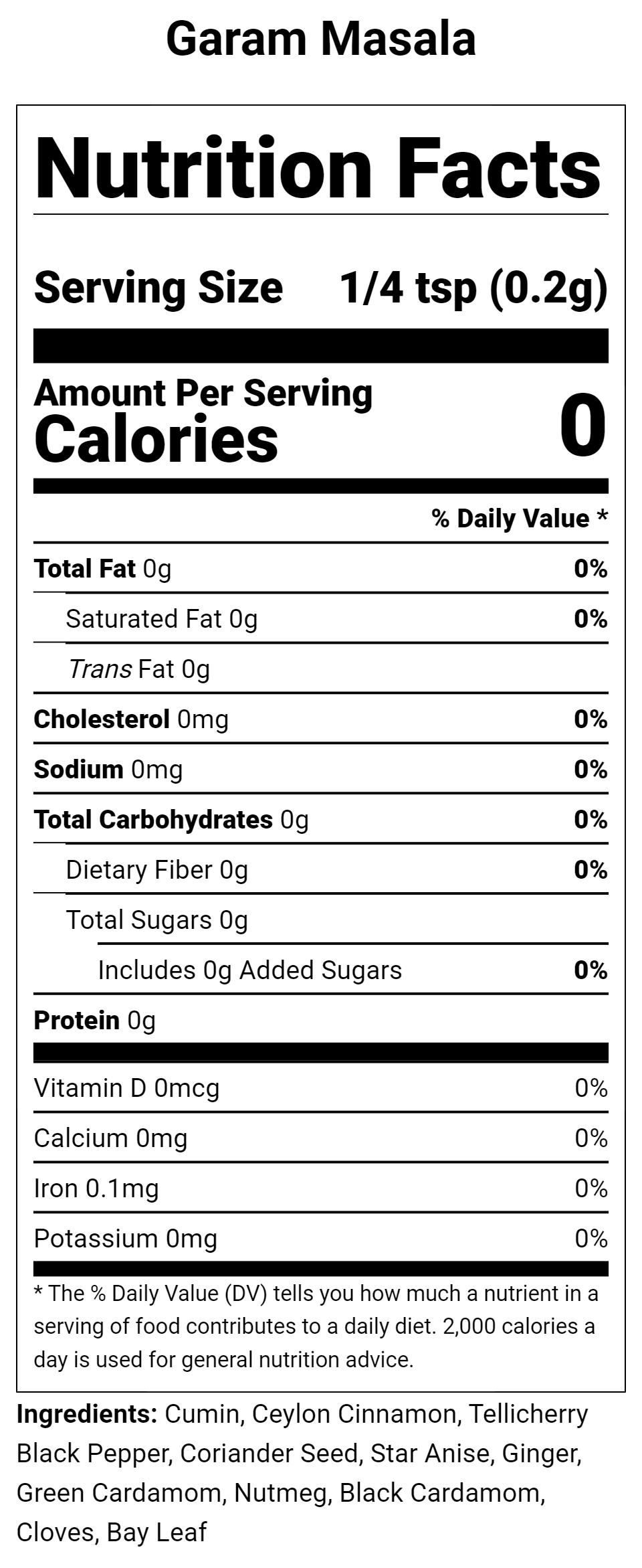 Cumin, Ceylon Cinnamon, Tellicherry Black Pepper, Star Anise, Coriander Seed, Green Cardamom, Ginger, Nutmeg, Black Cardamom, Cloves, Bay Leaf