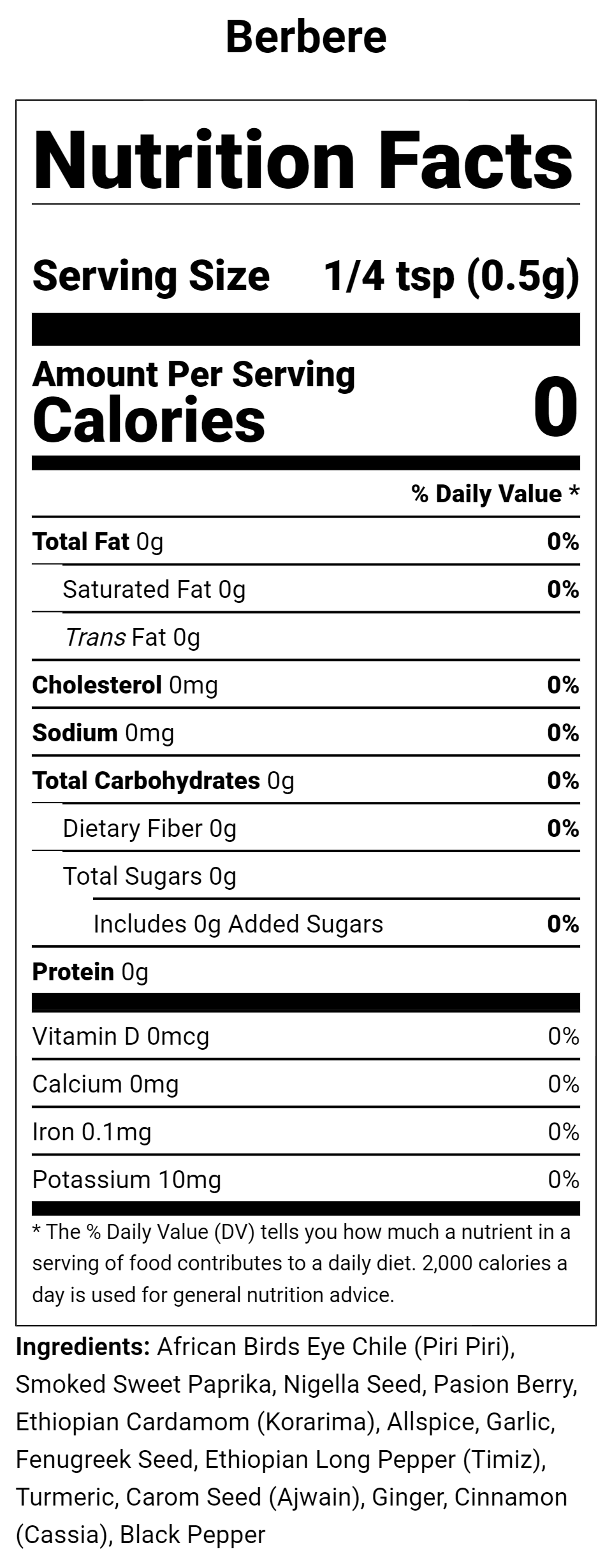 African Birds Eye Chile (Piri Piri), Smoked Sweet Paprika, Nigella Seed, Passion Berry, Ethiopian Cardamom (Korarima), Allspice, Garlic, Fenugreek Seed, Ethiopian Long Pepper (Timiz), Turmeric, Carom Seed (Ajwain), Ginger, Cinnamon (Cassia), Black Pepper
