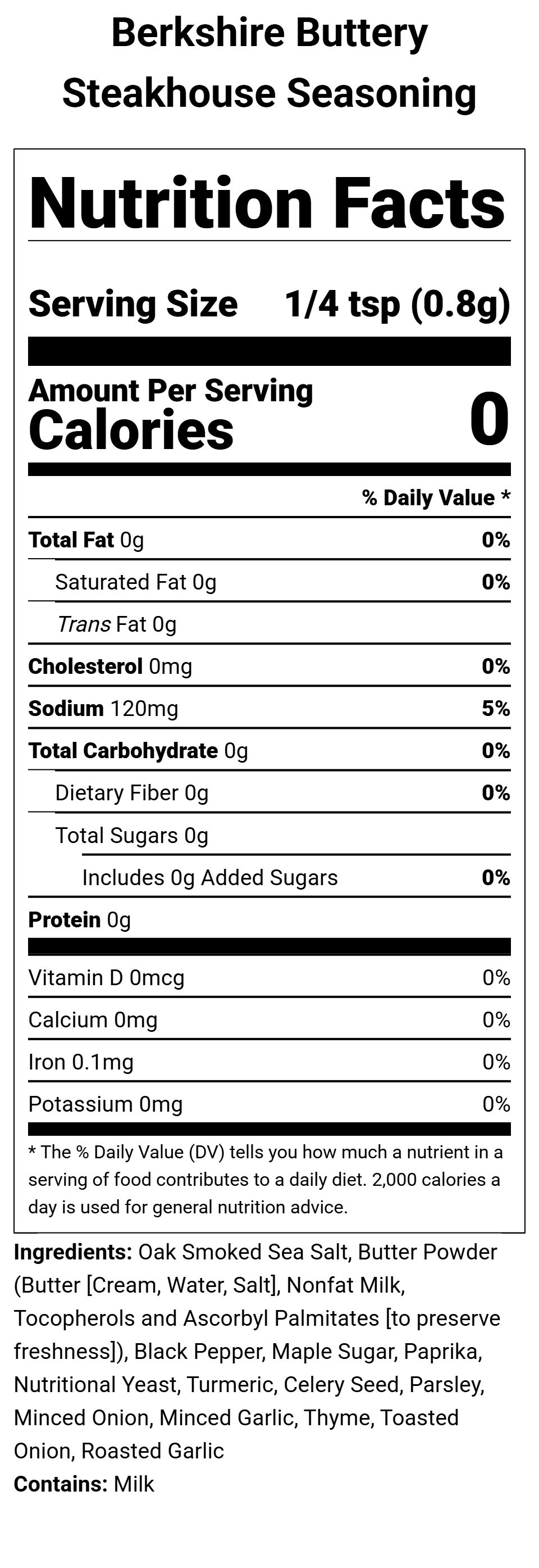 Whether searing steaks to juicy perfection, smoking succulent meats, or seasoning roasted vegetables, this luxurious blend delivers a decadent steakhouse flair to every dish. It’s equally at home elevating sides, hearty stews, creamy soups, savory dips, and so much more. From crafting a lavish steakhouse-inspired spread to transforming everyday meals, bring the buttery richness and refined complexity of fine dining to your kitchen with our proprietary Berkshire Buttery Steakhouse Seasoning.