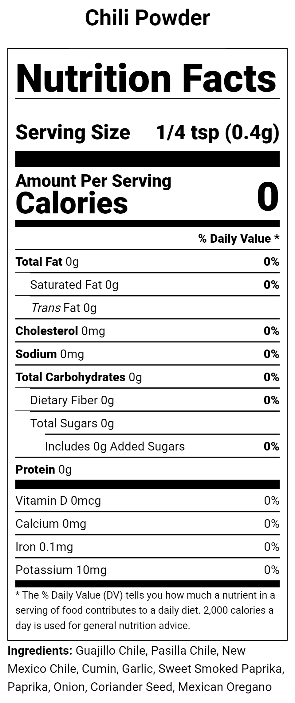 Guajillo Chile, Pasilla Chile, New Mexico Chile, Cumin, Garlic, Sweet Smoked Paprika, Paprika, Onion, Coriander Seed, Mexican Oregano