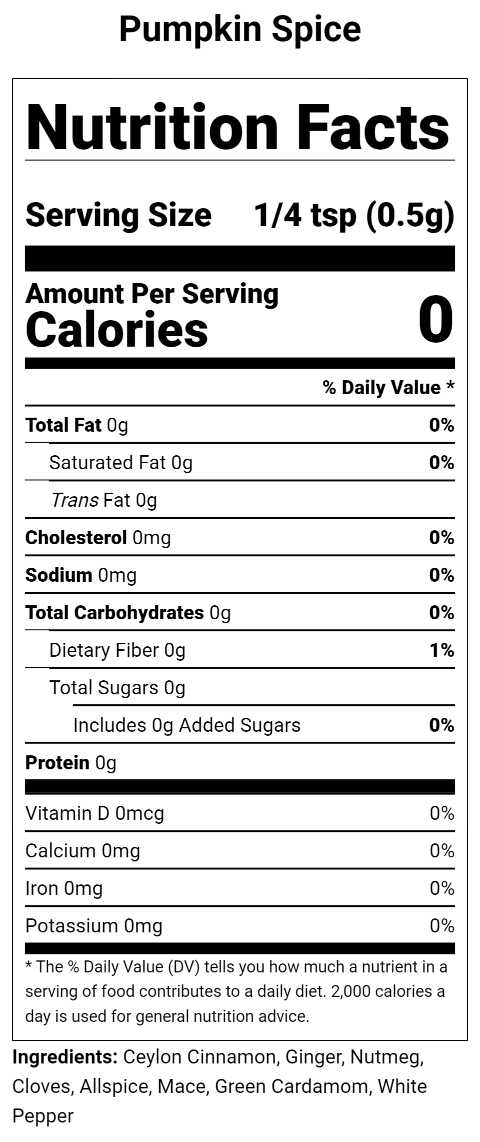Ceylon Cinnamon, Ginger, Nutmeg, Cloves, Allspice, Mace, Green Cardamom, White Pepper